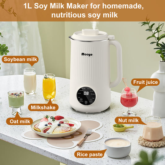 Ready to serve in 2 minutes - Using Mooye fully automatic soy milk machine, no prep work or clean up needed, you can get a glass of oat milk just in 2 minutes. There are 8 One-touch Automatic Programs can be choose-- juice; Soymilk; Almond milk; Milk shake; Boil Water; Oat Milk; Rice paste; Self-Clean. No need to pre-soak.